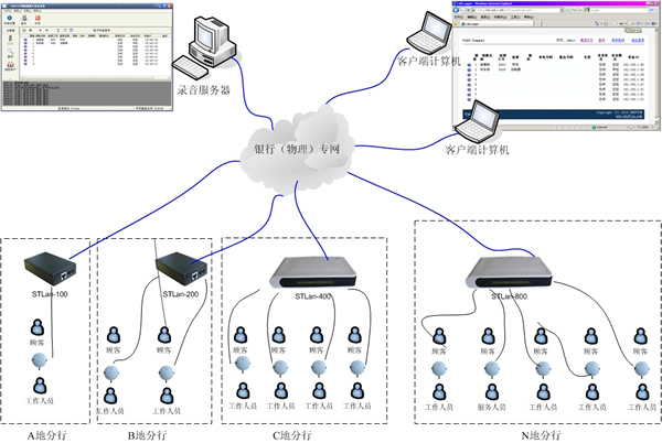 根据市场的需求,我们设计了用STLAN-VCA的纯音频采集方案。它的最大特点是分散录音集中存储。这种集中式不仅是小型局域网,甚至是大型专网,这种分布方式将分布在不同的网点,甚至不同的地区、省市集成在一起,十分便于管理。相对于普通的工控机+板卡的方式,是跨代的意义。