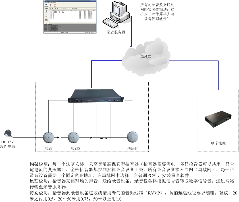 在每一个法庭现场放置一个拾音器(吸顶安装或者桌面安装),从机房布2芯RVVP音频专用线缆,连接拾音器的对应线缆,机房这头连接STLAN网络型数字录音设备的音频输入接口,从机房布2芯电源线缆或者就近取电。通常采用集中供电方式,一个合适的电源可以同时给数个监控拾音器供电。安装软件,并且进行配置。