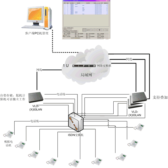 通过USB线缆对每一台设备进行相关的配置,将VLD-400LAN接入局域网,为每一台设备分配一个固定的IP地址,从电话线路上截取信号,便可实时记录通话内容。在局域网中选择任意计算机作为客户端通过网络对VLD-400LAN录音设备数据进行访问、实时监听。