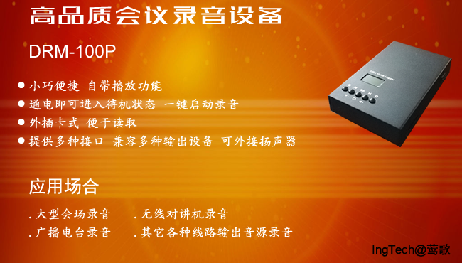 DRM-100P高品质会议录音设备的外拔插式SD卡座专为此设计,即插即用,录完带走,即方便又安全。播放的时候不需要专门的软件支持,使用Windows自带的MediaPlayer播放器或者其他大多数播放器即可播放会议内容。可脱离于计算机,独立录音。操作简单,一键启动一键停止。可设置声控启动录音。接口丰富提供低电平信号输入,可接未经放大的信号源。提供线路信号输入,可接调音台监听接口。提供外接扬声器输出。外插标准SD卡。携带方便。最大支持32G。